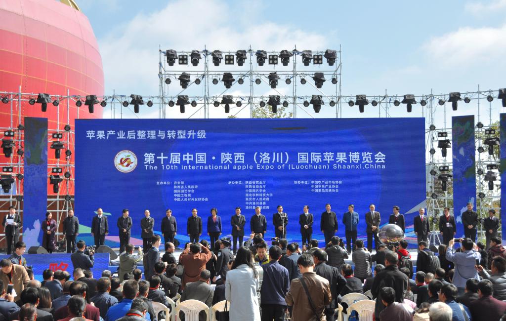 10月12日上午11时, 第十届中国·陕西(洛川)国际苹果博览会在洛川隆重开幕。农业部党组成员、人事司司长毕美家,全国政协常委、港澳台侨专委副主任、民革中央副主席、中华商标协会会长刘凡,农业部原党组成员、国务院参事室特约研究员、中国农产品市场协会会长张玉香,陕西省委常委、延安市委书记徐新荣,陕西省副省长冯新柱,陕西省军区原副政委杨辉出席开幕式。陕西省政府副秘书长薛建兴主持开幕式。